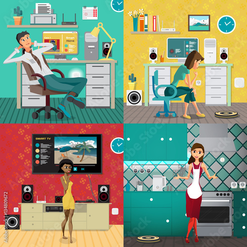 Торговый центр с магазинами мужской и женской одежды, модными бутиками, плоскими векторными иллюстрациями. Интерьер торгового центра со счастливыми покупателями, покупающими одежду, мобильный телефон. Вход в торговый центр. Розничный магазин.