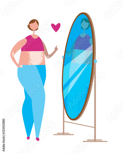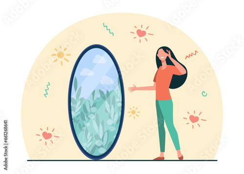 Молодая женщина примеряет красное платье перед зеркалом, векторная плоская иллюстрация, изолированная на белом фоне. Концепция покупок для веб-баннера, страницы веб-сайта и т.д.