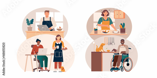 Торговый мужчина, женский набор мультяшных персонажей, плоская векторная иллюстрация. Счастливые люди наслаждаются покупками, распаковывают сумки дома. Супермаркет, торговый центр, магазин женской одежды, модный бутик, продуктовый магазин.