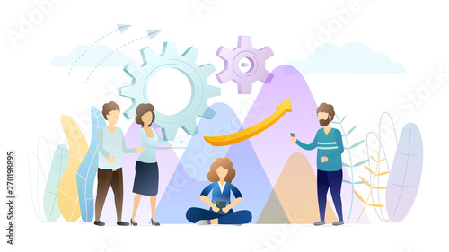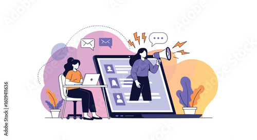 Огромный микрофон и микро мужские и женские персонажи с наушниками, мегафон, музыкальные ноты, ди-джей, использующий микшерные деки, векторная иллюстрация. Концепция шоу в ночном клубе с живой музыкой для веб-баннера на странице веб-сайта