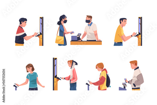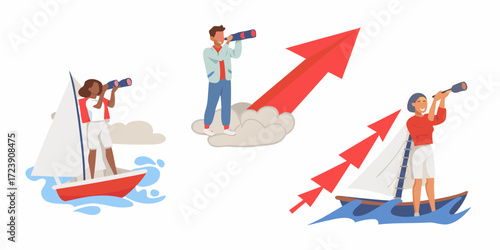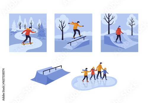 Набор скейт-парка, векторная плоская иллюстрация, изолированная на белом фоне. Изометрический пандус для скейтборда и другое оборудование для скейт-парка, фигуристы наслаждаются катанием на скейтбордах и роликовых коньках.