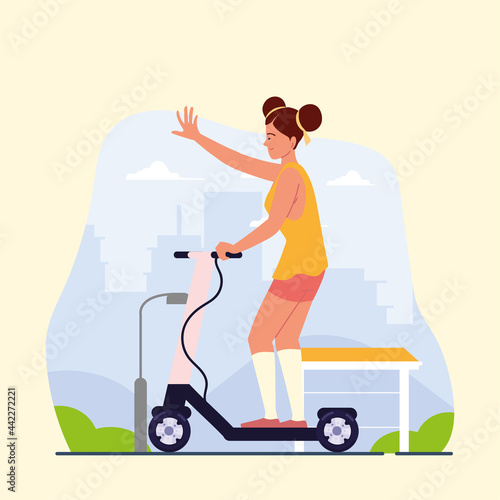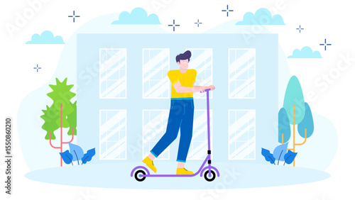 Мальчик-конькобежец в парке на скейтборде и роликах. Скейт-спорт и городской образ жизни векторная концепция иллюстрации. Человек на коньках. Шаблон дизайна веб-сайта.