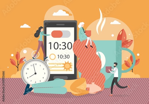 Огромный смартфон с приложением будильника, спящая девушка, векторная иллюстрация дизайна в плоском стиле. Концепция мобильного приложения-будильника с циклом сна.