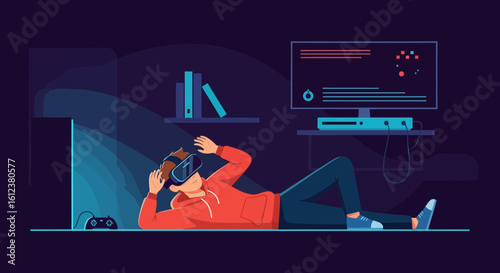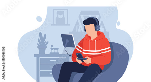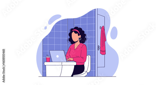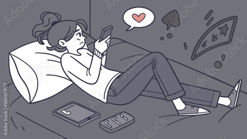 Супружеская пара, лежащая в постели, отвернувшись друг от друга, плоская векторная иллюстрация. Бессонная женщина, пользующаяся смартфоном, страдает от бессонницы. Стресс, депрессия, зависимость от смартфонов, нарушение сна.