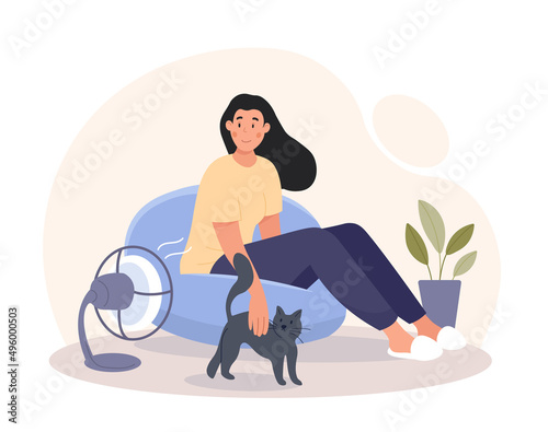 Сонная мама держит своего ребенка, сидя в кресле, плоская векторная иллюстрация. Уставшая, измученная мать со своим новорожденным ребенком и домашней кошкой.