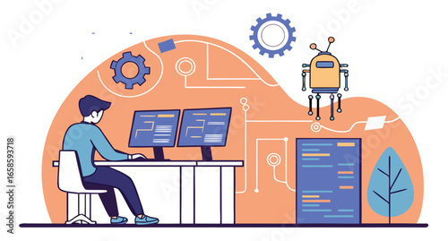 Дом с автоматизированной домашней охраной, освещением, другими системами, управляемыми с помощью смартфона, векторная иллюстрация. Концепция технологии умного дома Интернета вещей для веб-баннера, страницы веб-сайта и т.д.