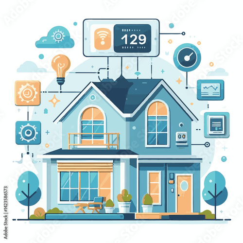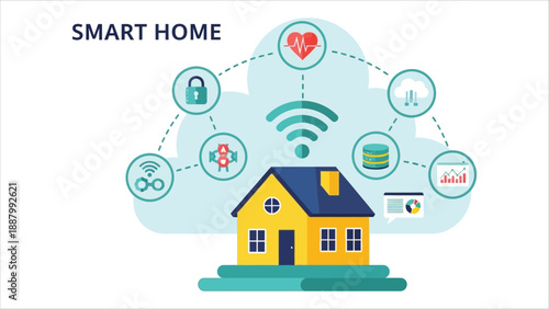 Векторная диаграмма технологической системы "Умный дом". Дом с дистанционно управляемой домашней охраной, системами освещения, вентиляции и другими интеллектуальными устройствами. Дизайн в плоском стиле.