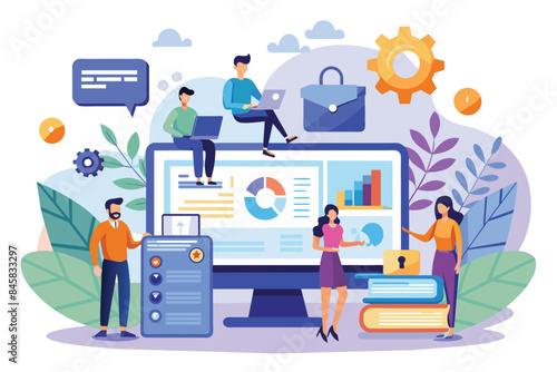 Векторная иллюстрация огромного компьютера с роботом на экране, микро-люди едут на самобалансирующемся моноколесе с ноутбуком в руках, играют в игры с использованием очков виртуальной реальности, игровых контроллеров. Умные современные гаджеты.