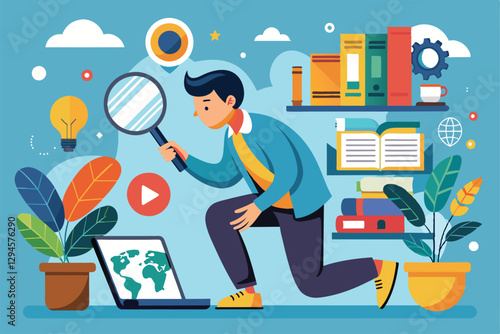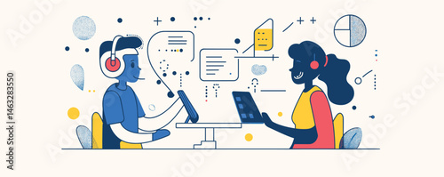 Векторная иллюстрация огромного робота, микро-персонажей мужского пола, получающих игровой опыт в гарнитуре виртуальной реальности, играющих в видеоигры с использованием игровых контроллеров. Концепция умных современных гаджетов для веб-баннера, страницы веб-сайта.