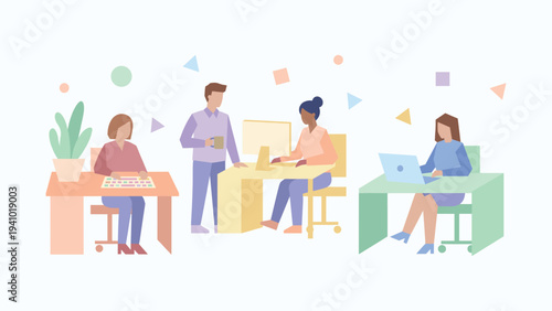 Деловые люди приветствуют умную роботизированную машину в офисе. Искусственный интеллект и люди, работающие вместе, плоская векторная иллюстрация. Искусственный интеллект и человеческое сотрудничество, кооперация.