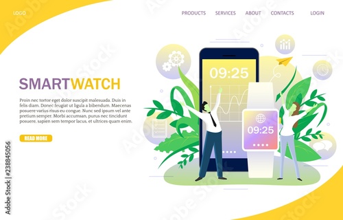 Шаблон веб-сайта целевой страницы Smartwatch. Векторная иллюстрация смартфона и смарт-часов, показывающих одно и то же время. Концепция интеллектуального цифрового устройства, синхронизация мобильного телефона и умных часов.