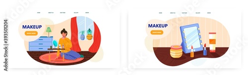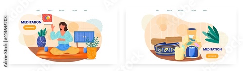 Дизайн целевой страницы для курения, набор шаблонов баннеров веб-сайта, плоская векторная иллюстрация. Молодая женщина расслабляется, куря кальян в гостиной. Зависимость от кальяна и табака, вредные привычки. Нездоровый образ жизни.