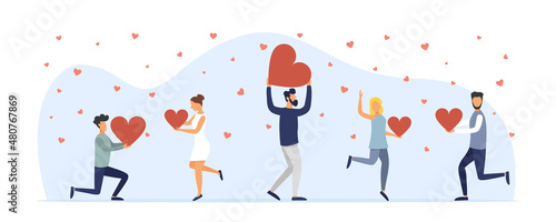 Зимняя сцена, снегопад, молодая пара играет в снежки, человек скользит по льду, векторная иллюстрация. Концепция зимней снежной погоды для веб-баннера, страницы веб-сайта и т.д.