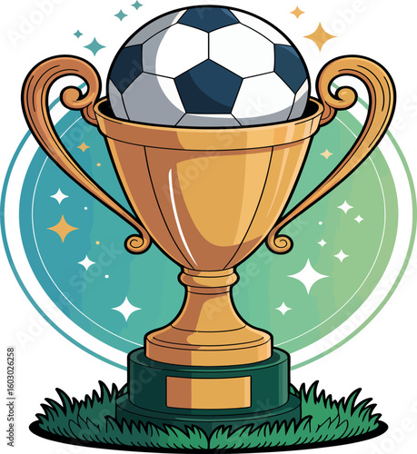 Футбольный мяч, футбольный кубок и зеленое поле, 3d векторная иллюстрация. Чемпионат по футболу, предыстория футбольного турнира.