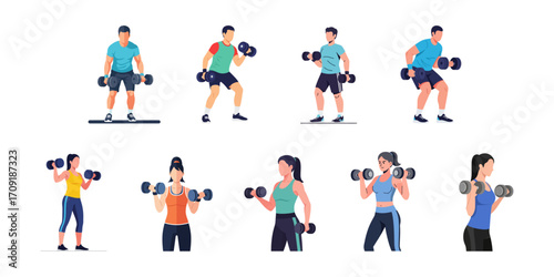 Набор футболистов, плоская векторная изолированная иллюстрация. Дети с тренером, взрослые персонажи мультфильмов мужского и женского пола играют в футбол, пинают мяч, держат золотой кубок. Школьный футбольный матч, чемпионат.