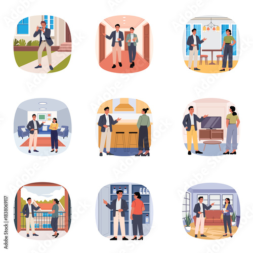 Набор социального дистанцирования, плоская векторная иллюстрация. Люди в медицинских масках соблюдают дистанцию в супермаркете, парке клиники, кафе metro cinema. Социальное дистанцирование для профилактики заболевания Covid-19 - новая норма.