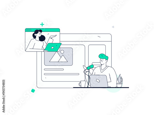 Шаблон домашней страницы веб-сайта службы обмена социальными фотографиями. Элемент дизайна в векторном плоском стиле с пробелом для копирования и кнопкой "Подробнее".