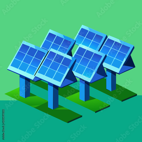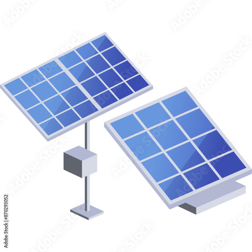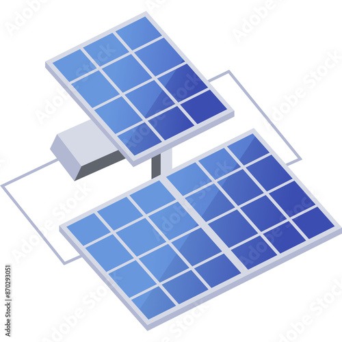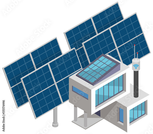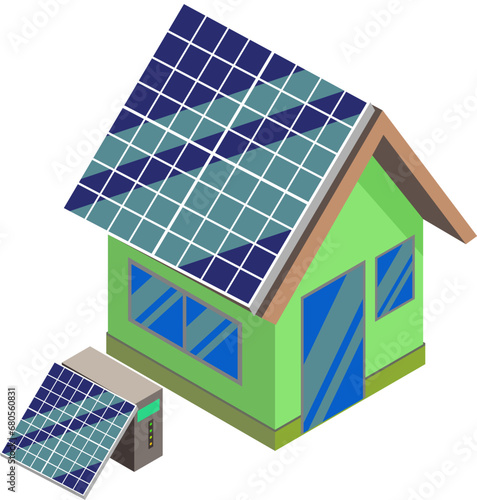 Изометрический вектор, установленный на крыше панельного солнечного дома. Домашнее здание с фотоэлектрическим элементом для выработки электроэнергии, 3d-значок, выделенный на белом фоне