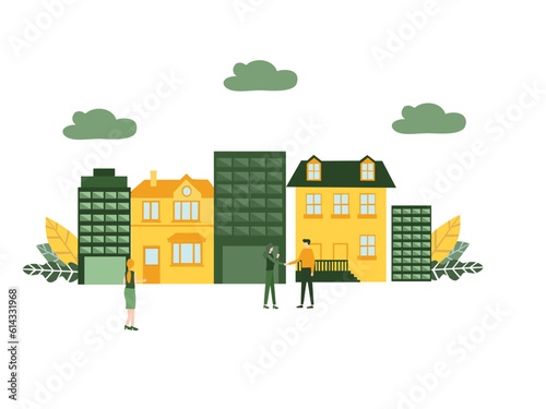 Векторная плоская иллюстрация производства, хранения и потребления электроэнергии. Рука, держащая батарею солнечной энергии, жилой дом с солнечной панелью, вилка. Концепция возобновляемых источников энергии и зеленых технологий.