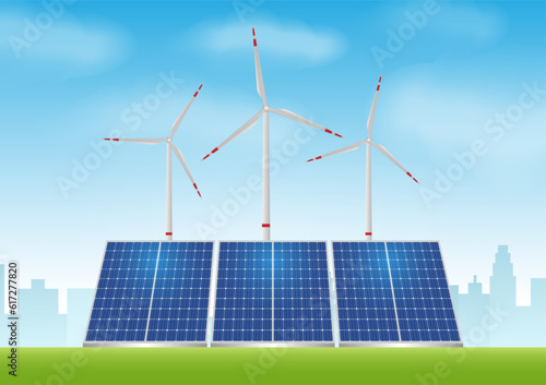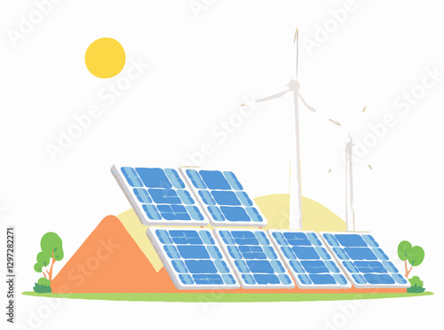 Солнечная электростанция и завод. Солнечные панели. Промышленная концепция зеленой энергетики. Векторная иллюстрация в плоском стиле. Фон солнечной станции. Возобновляемые источники энергии.