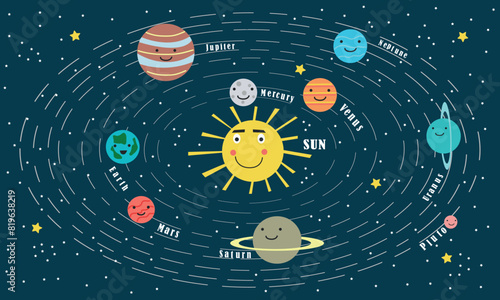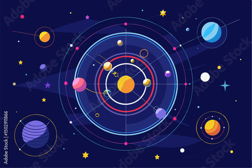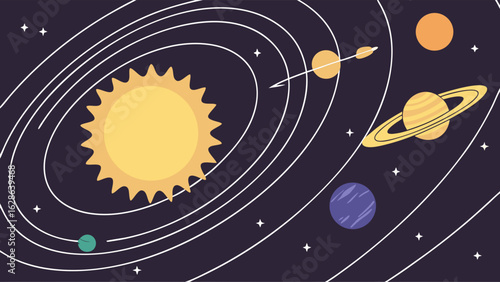 Схема модели Солнечной системы, шаблон образовательного плаката. Векторная многослойная вырезка из бумаги в стиле Солнца и восьми планет вокруг него, самых больших объектов в Солнечной системе.