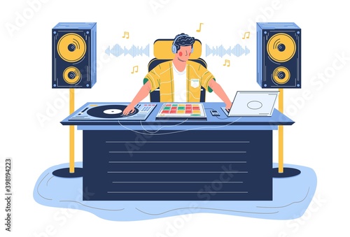 Звукорежиссер, создающий звуковые эффекты, плоская векторная иллюстрация. Производство фильмов, телепрограмм. Индустрия развлечений. Ночной клуб, танцевальная дискотека, ди-джей играет музыку.