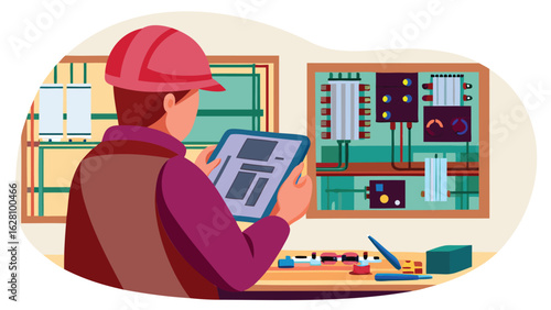 Звукорежиссер, инженер, редактор, создающий музыку в студии, плоская векторная иллюстрация. Запись звука и музыки, монтаж и сведение.