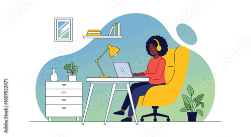 Женщина-звукорежиссер, инженер в наушниках, создающая, записывающая музыку, плоская векторная иллюстрация. Студия звукорежиссуры.