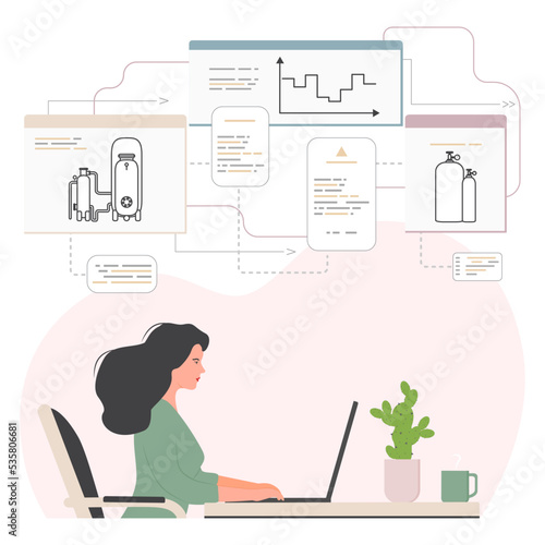 Женщина-звукорежиссер, инженер в наушниках, создающая, записывающая музыку, плоская векторная иллюстрация. Студия звукорежиссуры.