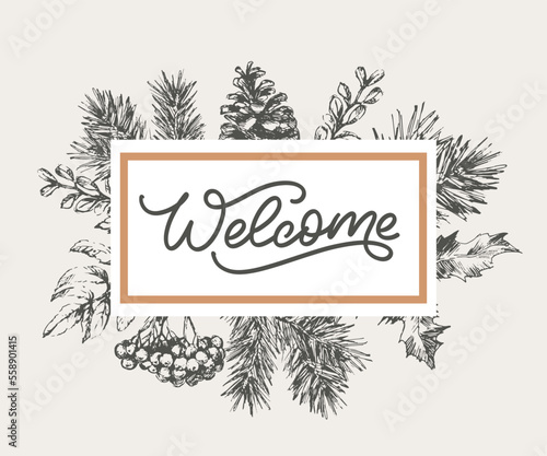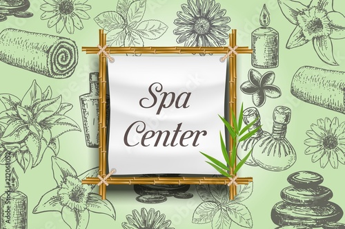 Спа-плакат, шаблон баннера. Векторная реалистичная бамбуковая рамка с надписью спа-центра и элементами спа-салона, нарисованными вручную чернилами.