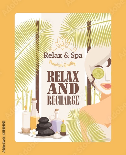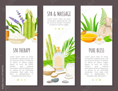 Набор шаблонов векторных баннеров спа-центра. Реалистичные бамбуковые стебли с листьями, солью, камнями, массажным маслом, ароматическими свечами и цветами. Пригласительный флаер для спа-салона красоты и велнеса или рекламный плакат.
