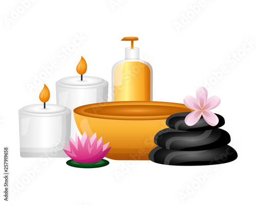 Шаблон дизайна векторного плаката спа-салона и салона красоты с реалистичной косметикой, камнями, цветами орхидеи и пространством для копирования.