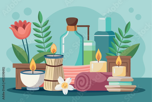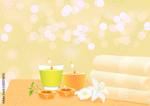 Шаблон рекламного плаката салона санаторно-курортного лечения, векторная реалистичная иллюстрация. Спа-фон с бамбуком, ароматическими свечами, солью, камнями, бутылочками с маслом, полотенцами и копировальным пространством.