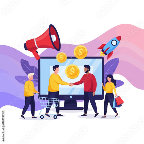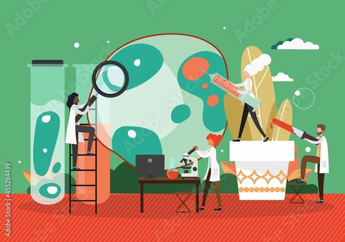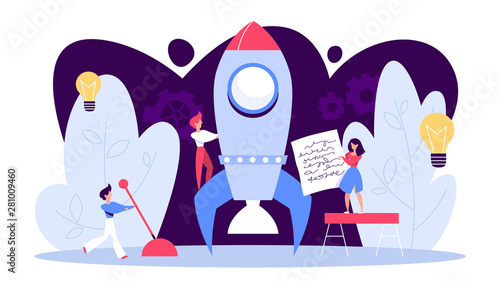 Мужские и женские персонажи готовят ракету и астронавта к космическому путешествию, смотрят в телескоп, векторная иллюстрация дизайна в плоском стиле. Освоение космоса, запуск ракет, астрономия.