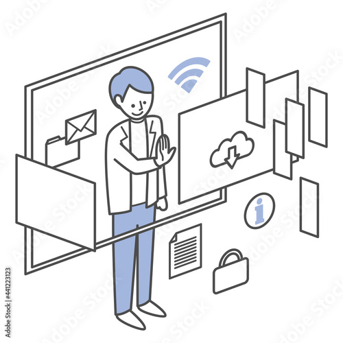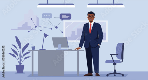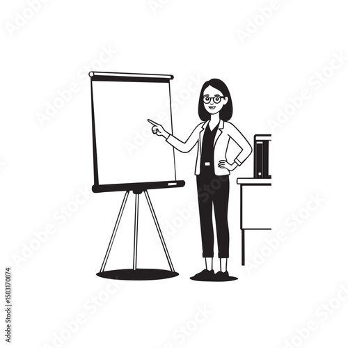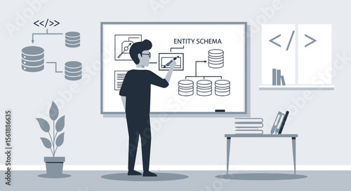 Векторная иллюстрация ученого, инженера-конструктора, выступающего с презентацией или лекцией. Освоение космоса, развитие аэрокосмических технологий, концепция образования в области космических наук. Дизайн в плоском стиле.