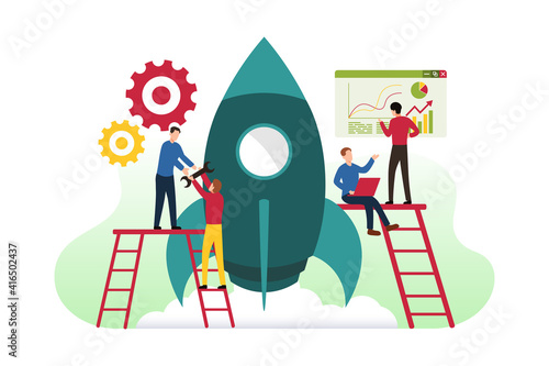 Векторная иллюстрация крошечных инженеров-людей, строящих большую ракету, астронавта. Технология освоения космоса, концепция аэрокосмической промышленности для веб-баннера, страницы веб-сайта и т.д.