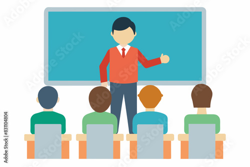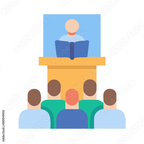 Спикер на подиуме, стоящий перед аудиторией векторная иллюстрация. Оратор, выступающий с трибуны. Бизнесмен произносит речь. Бизнес-тренинг, коучинг, презентация инвестиционного проекта