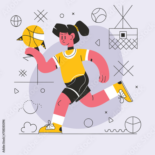Занятия спортом и фитнесом. Молодая женщина едет на велотренажере, плоская векторная иллюстрация. Девушка посещает занятия велоспортом в помещении. Фитнес-зал, кардиотренировка. Активный и здоровый образ жизни.