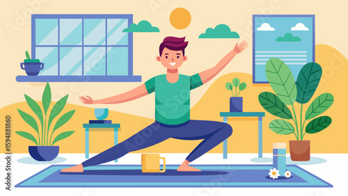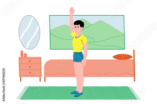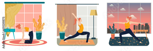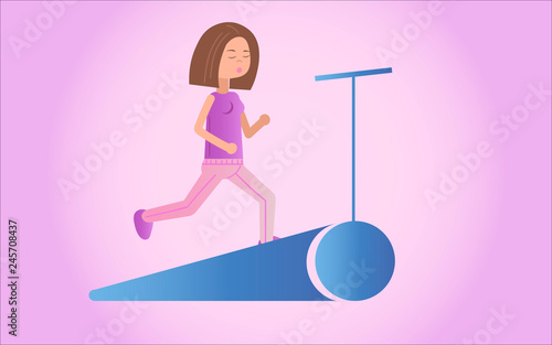 Занятия спортом и фитнесом. Молодая женщина, выполняющая аэробные упражнения тхэ бо, плоская векторная иллюстрация. Тренировка тхэ бо, техника боевых искусств. Кардио-тренировка в фитнес-зале. Активный и здоровый образ жизни.