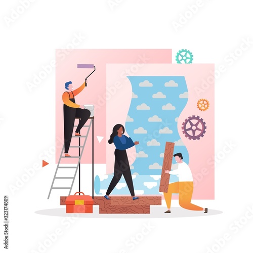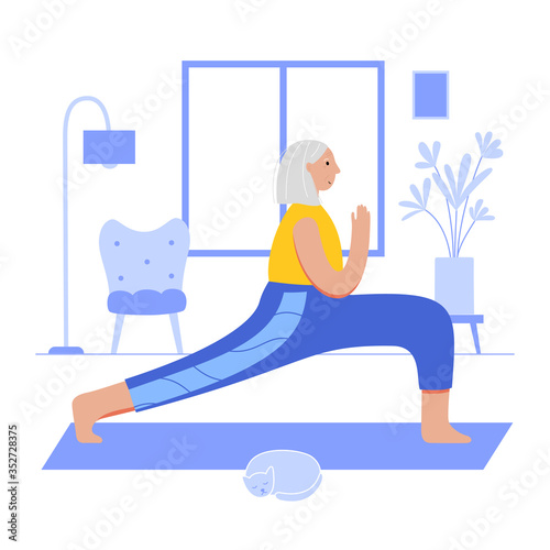 Занятия спортом и фитнесом. Молодая женщина делает упражнения на растяжку, плоская векторная иллюстрация. Фитнес-тренировка на растяжку, снятие стресса. Активный и здоровый образ жизни.