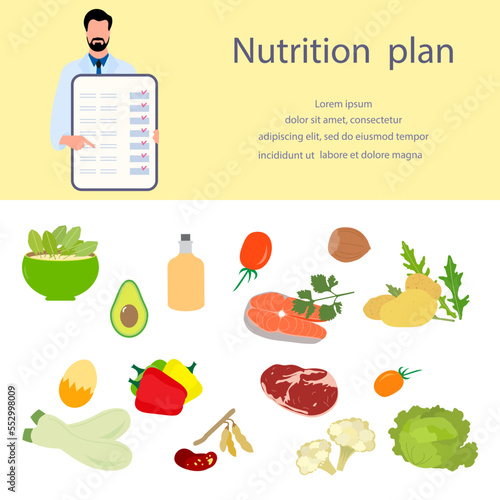 Векторный плакат о спорте и здоровье. Календарь дат, расписание тренировок, здоровое питание для похудения и наращивания мышечной массы, иллюстрации для создания фитнес-оборудования и спортивной одежды