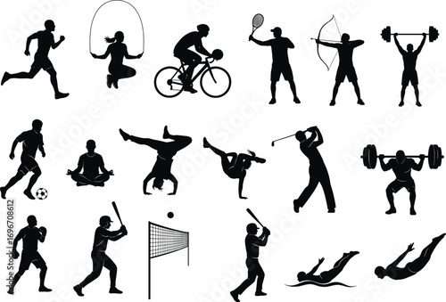 Спортивные люди, силуэт профессионального спортсмена, набор персонажей мужского и женского пола, векторная изолированная иллюстрация. Художественная гимнастика, фехтование, стрельба из лука, метание копья, баскетбол, бодибилдинг.