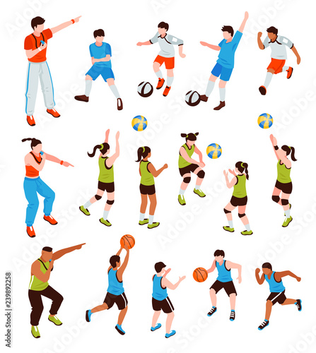 Набор спортивных людей, плоская векторная изолированная иллюстрация. Изометрические баскетболисты, футболисты, волейболисты, хоккеисты, теннисисты и легкоатлеты-бегуны. Профессиональные спортсмены, занимающиеся спортом.