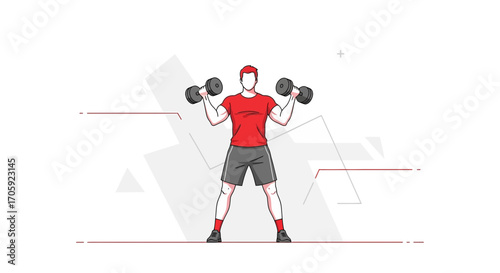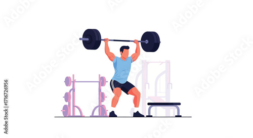 Человек, выполняющий упражнения со штангой, векторная плоская иллюстрация, изолированная на белом фоне. Тяжелая атлетика, силовые тренировки, силовые упражнения, спорт и здоровый образ жизни.