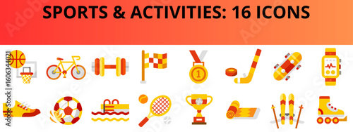 Набор шаблонов баннеров для заголовка сайта спортивной распродажи. Модная спортивная одежда с плоским рисунком, аксессуары для тренировок и экипировка, награды и принадлежности для болельщиков, векторная иллюстрация. Материалы для продвижения скидок
