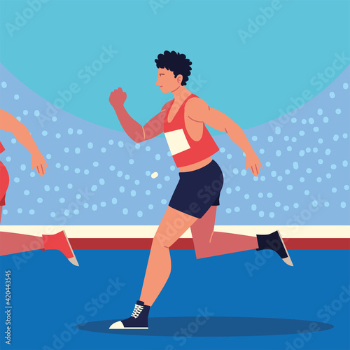 Векторная иллюстрация концепции бега спортсмена в стиле ретро-комического поп-арта. Мужчина-спортсмен пробежал марафон.