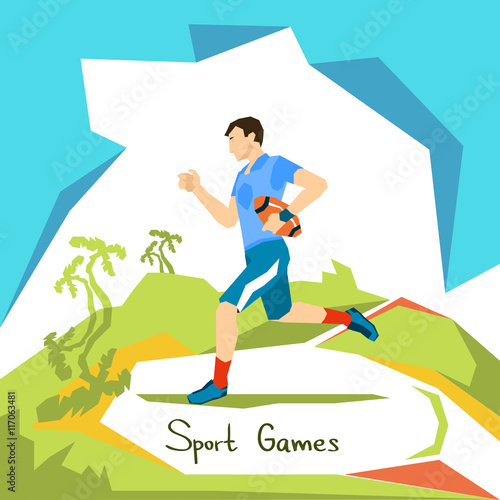 Векторная иллюстрация молодого человека в наушниках, тренирующегося в парке. Элемент дизайна в плоском стиле спортсмена.