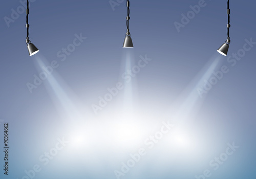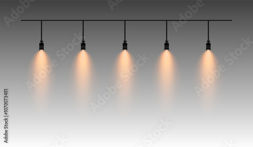 Белая пустая полка с точечными светильниками, векторная реалистичная иллюстрация. Концепция домашнего освещения и потолочных светильников.