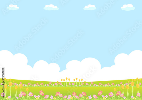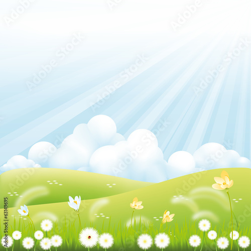 Весеннее поле, векторная иллюстрация в стиле бумажного искусства. Зеленая трава, весенние цветы, голубое небо с белыми облаками. Природный ландшафт.