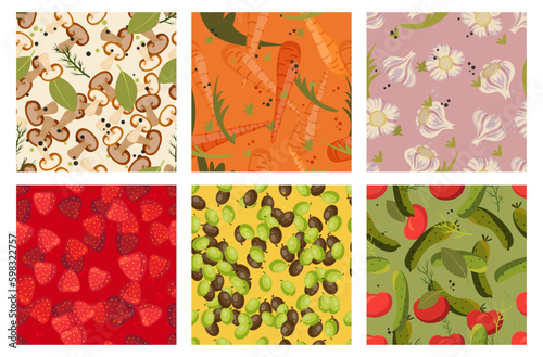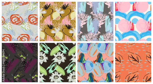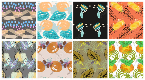 Бесшовный узор из весенних цветов. Векторный набор цветочных фоновых узоров. Цветение сакуры, деревенские фермерские дома с деревьями, цветы тюльпанов.